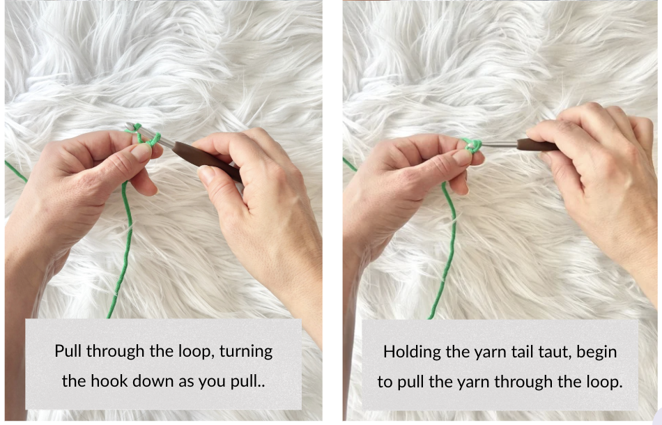 When working in rows, the slip knot is the first step to be able to take the yarn from the skein to getting started on your crochet hook. Check out the steps in the photo tutorial below OR view the full video link below.