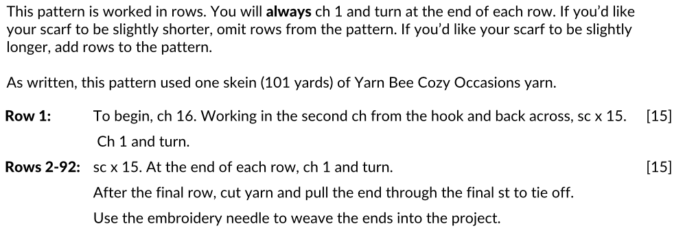 You’ve made it through all of the tutorial steps, so let’s get to actually making something! Follow the steps below to make your very own beginner crochet scarf! The pattern written includes as many rows as I could make using one skein of Cozy Occasions super bulky yarn from Hobby Lobby (101 yards). If you’d like your scarf to be shorter, you can omit some of the rows. If you’d like your scarf to be longer, you can add more rows (you will need another skein of yarn!).