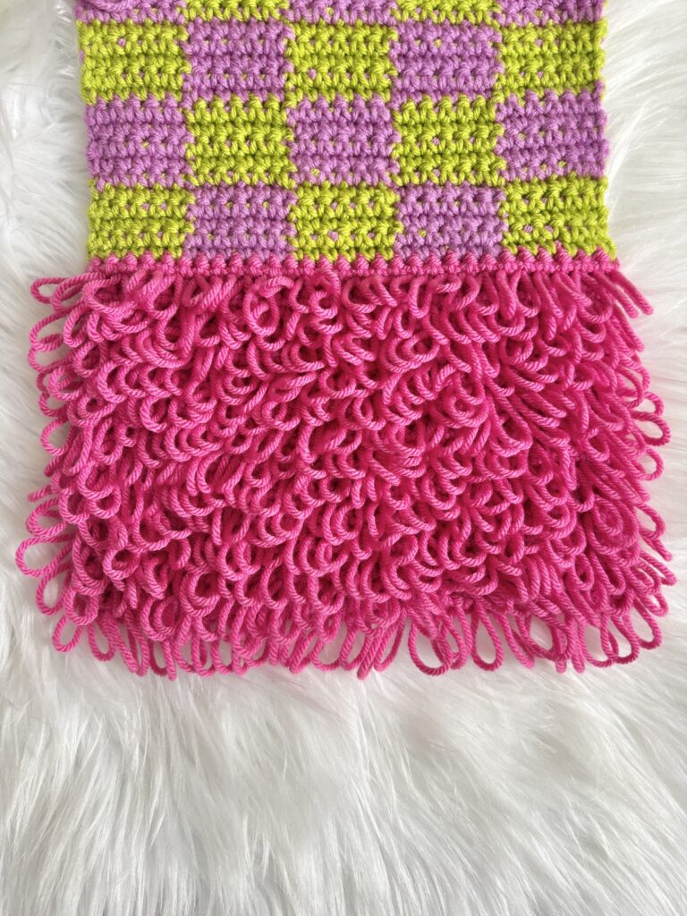 Block One in our Stitchwork Scarf is the loop stitch. This is a textured stitch with loops coming off the front of the work giving a fun and whimsical look to your work!