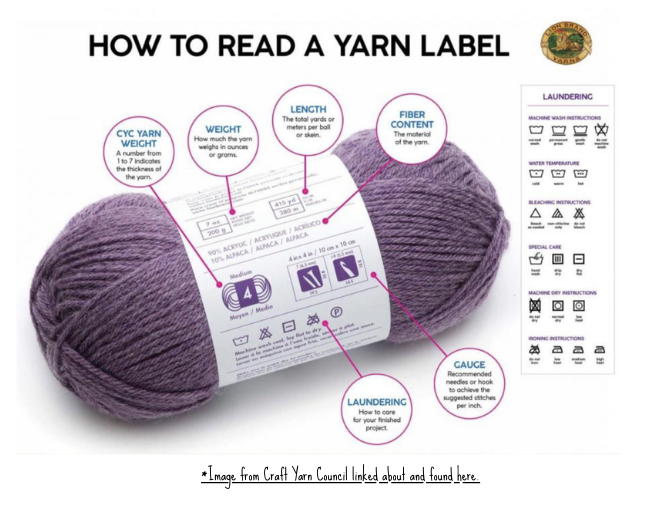 Understanding how to read a yarn label and what all of the symbols and information means, is essential to figuring out which yarn and hook will be best for your project. Below is an image from the Craft Yarn Council website with improtant information found on yarn labels. The Craft Yarn Council has an excellent tutorial for reading yarn labels linked here.