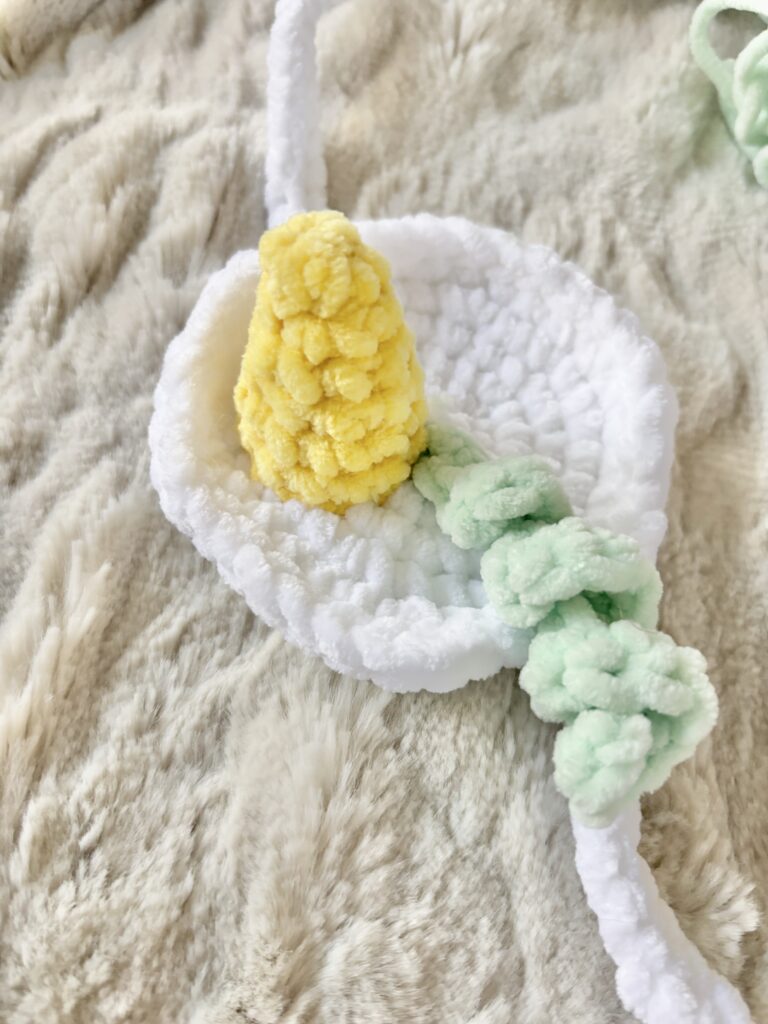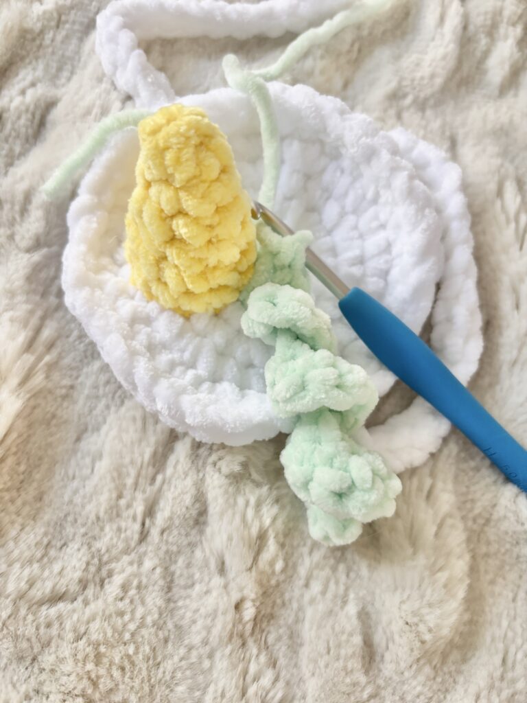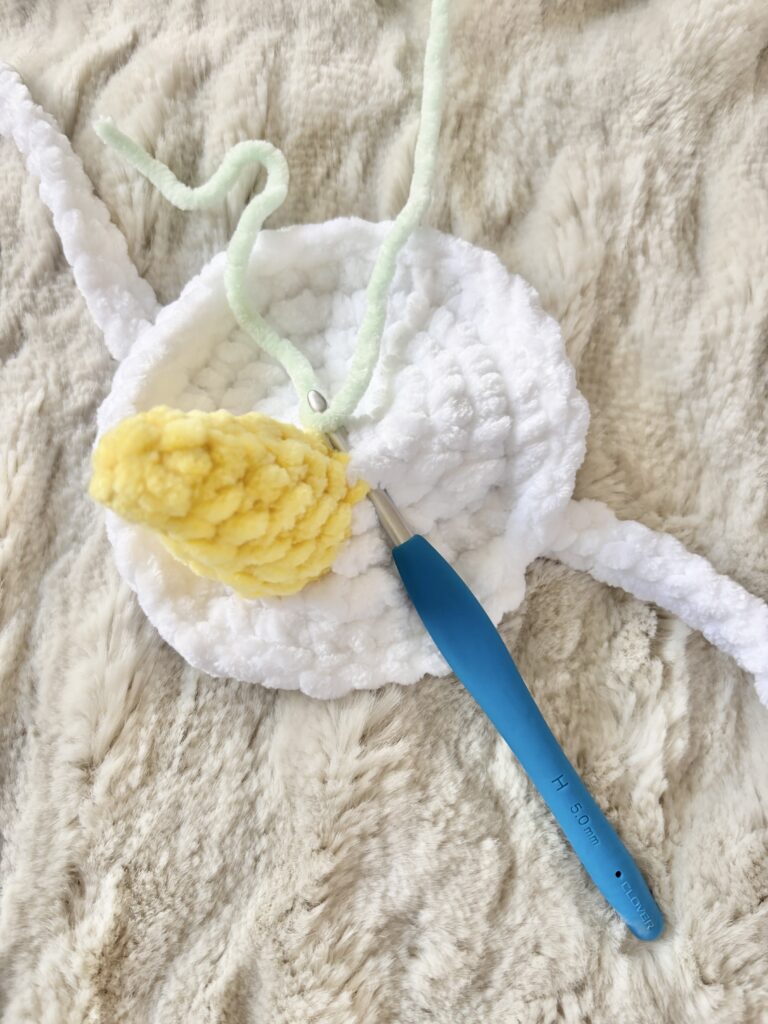 After completing the rounds, cut yarn and tie off. Leave a long tail to sew to the top of the unicorn hat.